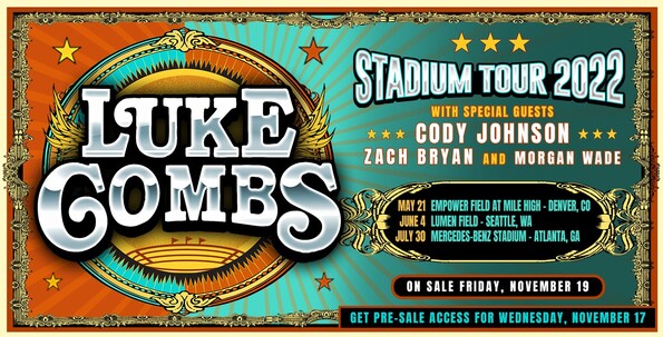 November 12, 2021—Country superstar and newly minted CMA Entertainer of the Year Luke Combs will embark on his first-ever headline stadium tour next year with performances at Denver’s Empower Field at Mile High on May 21, Seattle’s Lumen Field on June 4 and Atlanta’s Mercedes-Benz Stadium on July 30. Special guests featured on the tour include Cody Johnson, Zach Bryan and Morgan Wade. See below for complete details.
